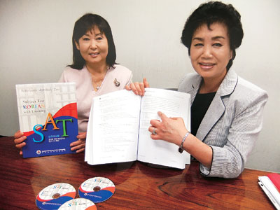 ▲ 미주한국학교연합회 김혜순 회장(오른쪽)과 최정인 부회장이 새로 나온 SAT 한국어 시험 교재 내용을 설명하고 있다.
