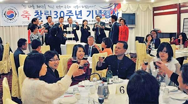 미주한국학교연합회(회장 최정인)는 지난 28일 LA 한국교육원에서 ‘창립 30주년 기념식’을 가졌다. 이날 참석한 남가주 각 지역 주말한국학교 교장 및 교사 240여명은 2세 한국어 교육의 중요성을 되새겼다. 창립 30주년 기념식에 참석한 교사들이 건배를 하고 있다.